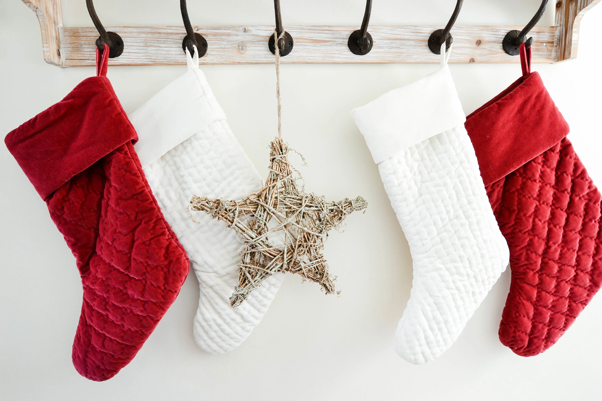 First up: hooks. The coat hooks in your mudroom will work perfectly - some festivity first thing as you enter the house. If you don't have a chimney (and mantle), Santa's coming in the front door anyhow. Or, command strip a hook rack on a wall in your living room. The perfect (temporary), seasonal solution.