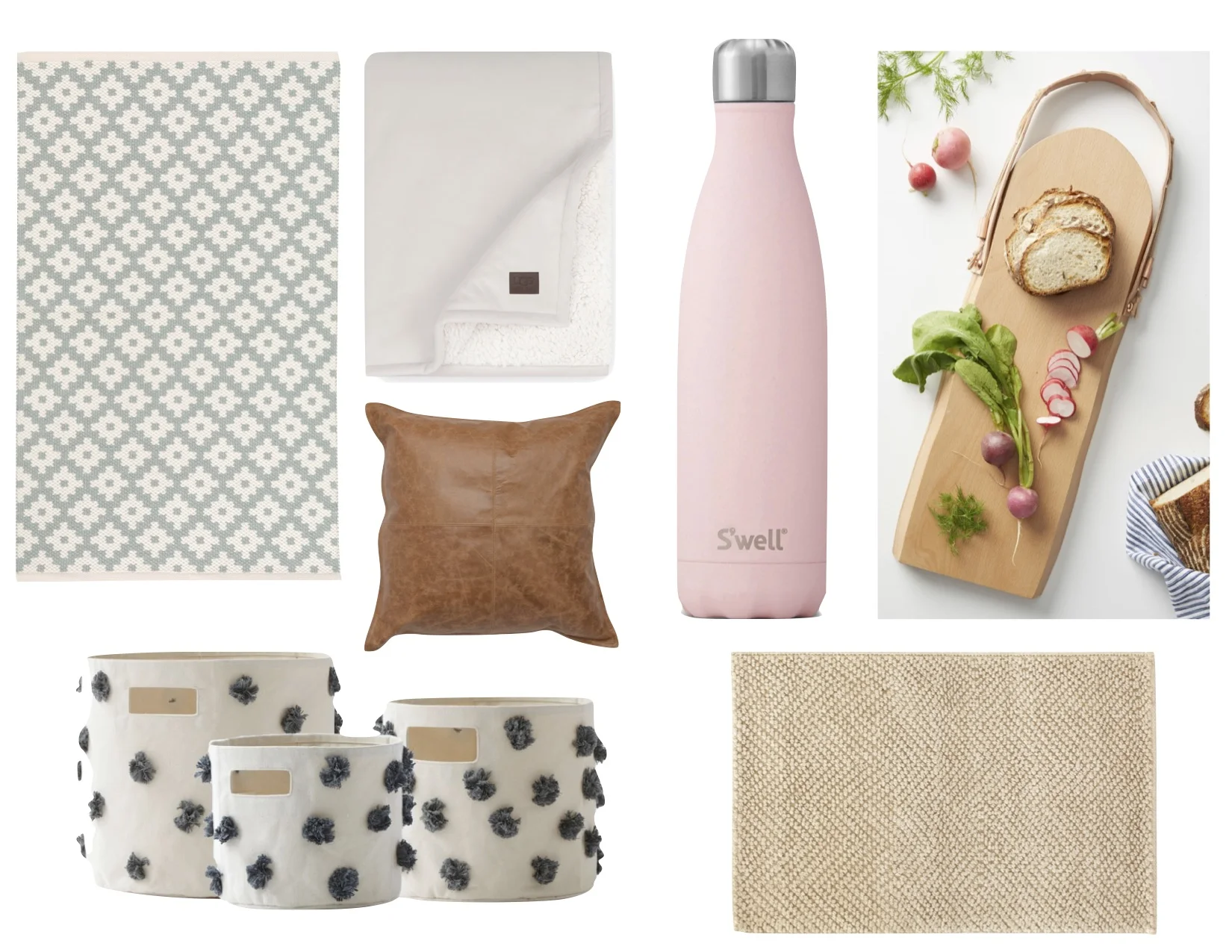 From top left (counter clockwise) - Samode rug / Ugg throw blanket / Swell water bottle / cutting board / jute rug / pom pom bins / leather pillow
