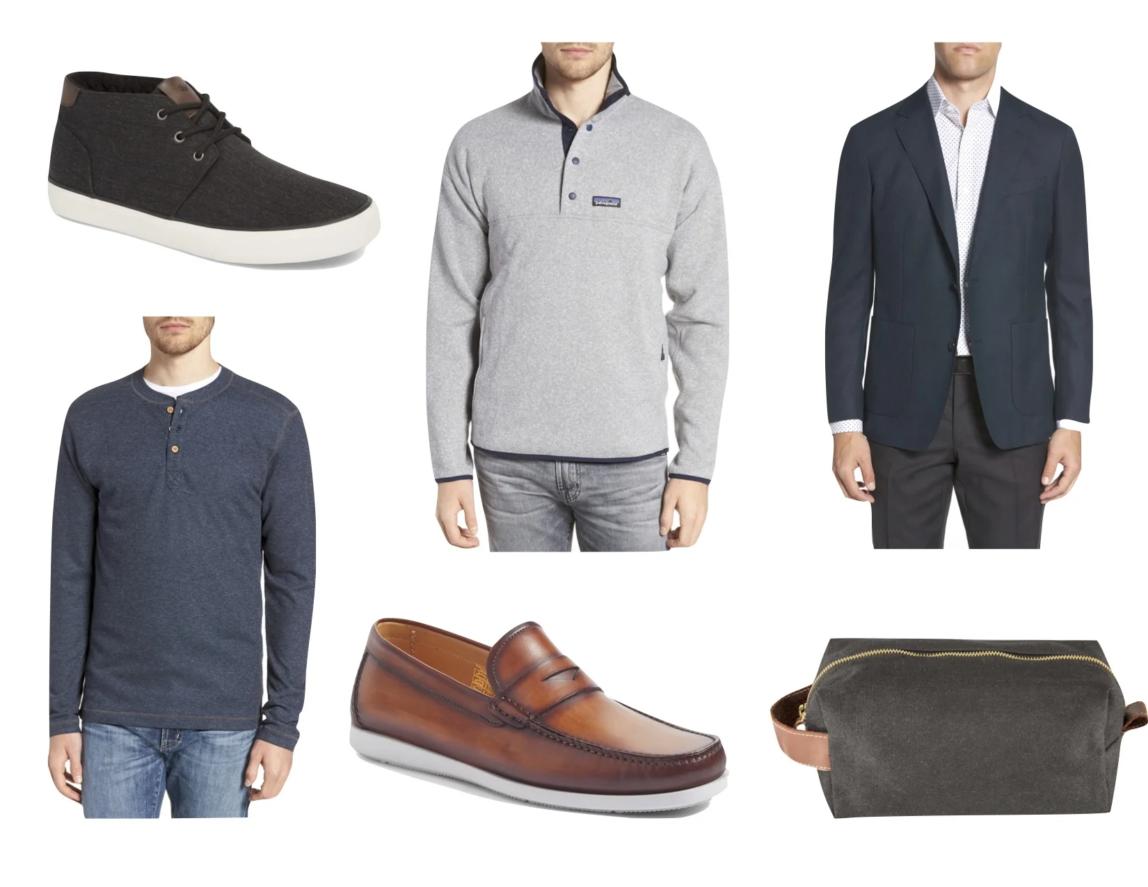 from top left (counter clockwise) - chukka sneaker / Patagonia pullover / blazer / toiletry bag / penny loafer / henley shirt