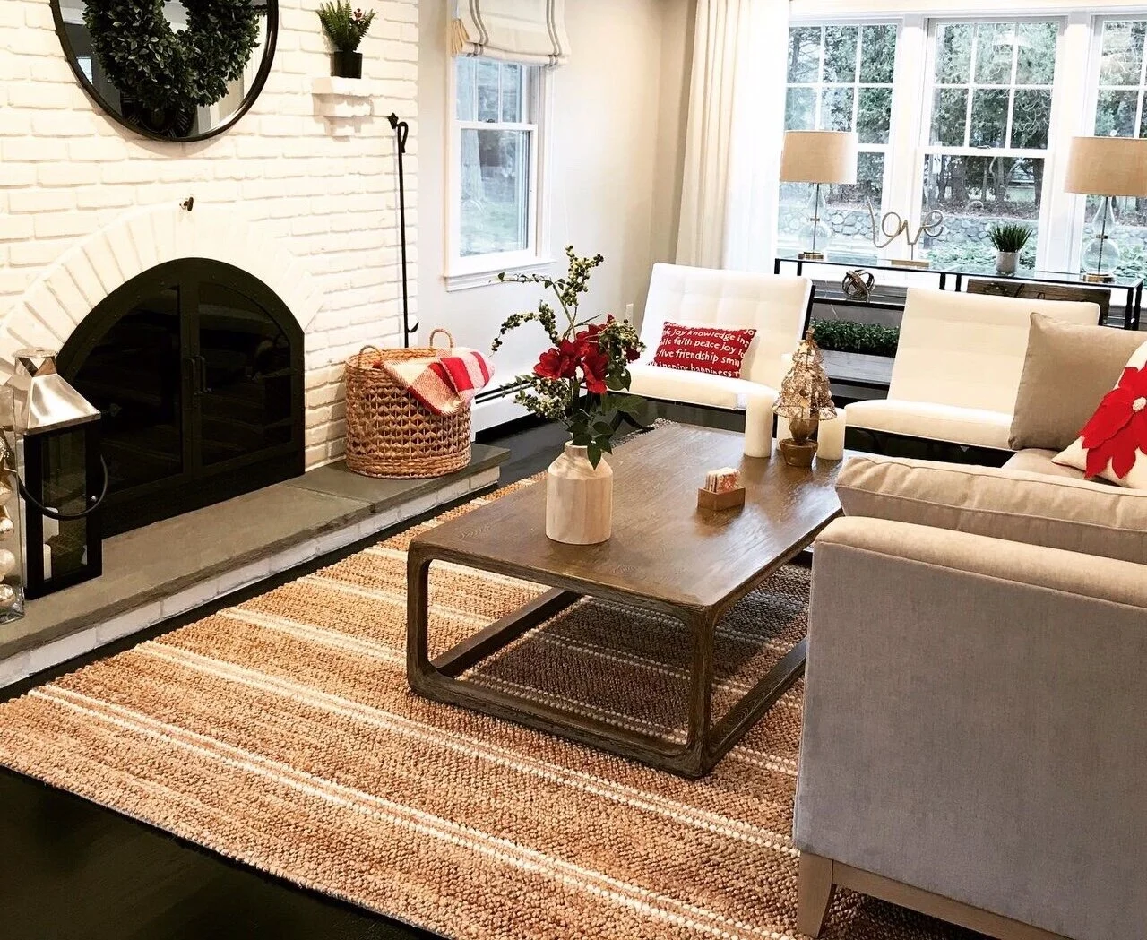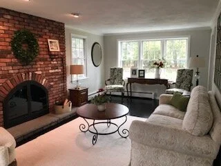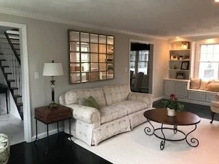 We were so excited to see the layout changes we advised, the fireplace transformation look as beautiful as we knew it would and the window treatments updated per our suggestion. She even added the two poufs in front of the window seat like we recommended! Doesn’t it look awesome?