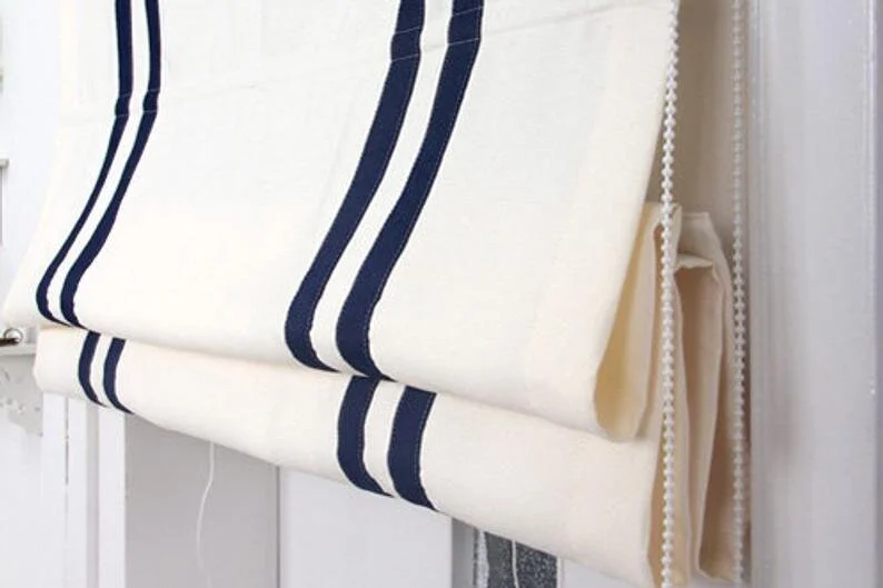 Finally, let’s talk window treatments. If she wants to add treatments, we recommend ivory linen drapes for the triple window behind the console table. Head to our prior post (Vol. 1) for options on drapes and drapery hardware. For all other windows (flanking the fireplace and above the built-in bench), we like fabric roman shades. The fabric could also be a plain ivory linen or ivory linen with an accent stripe (blue or gray). Here is the source.