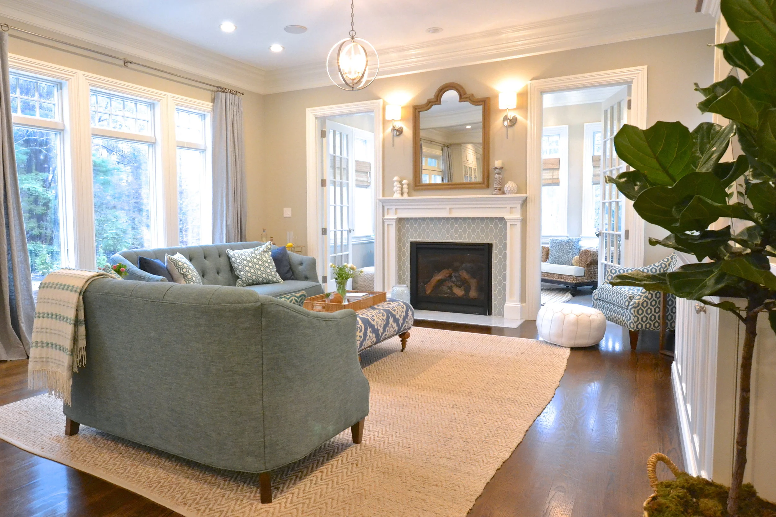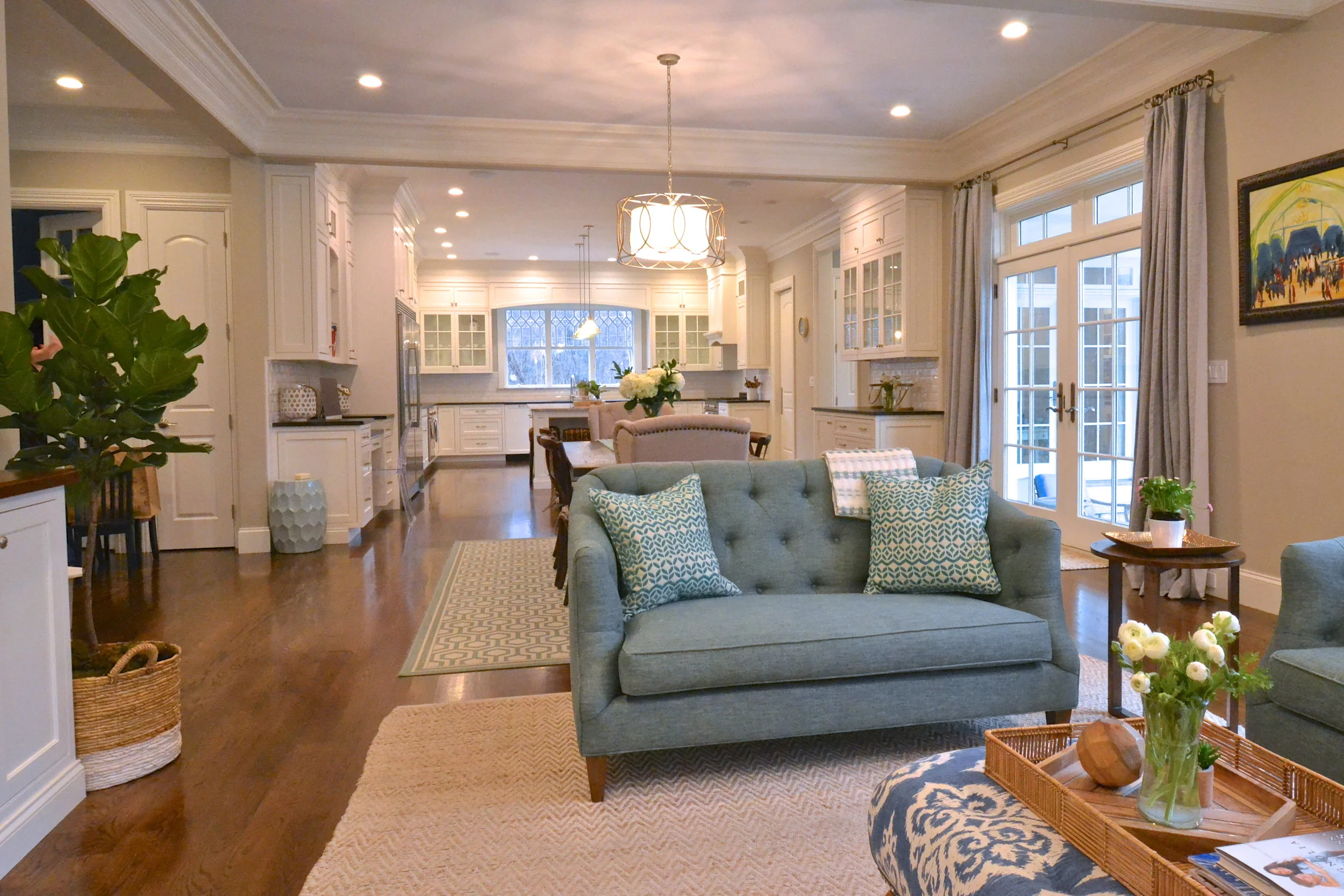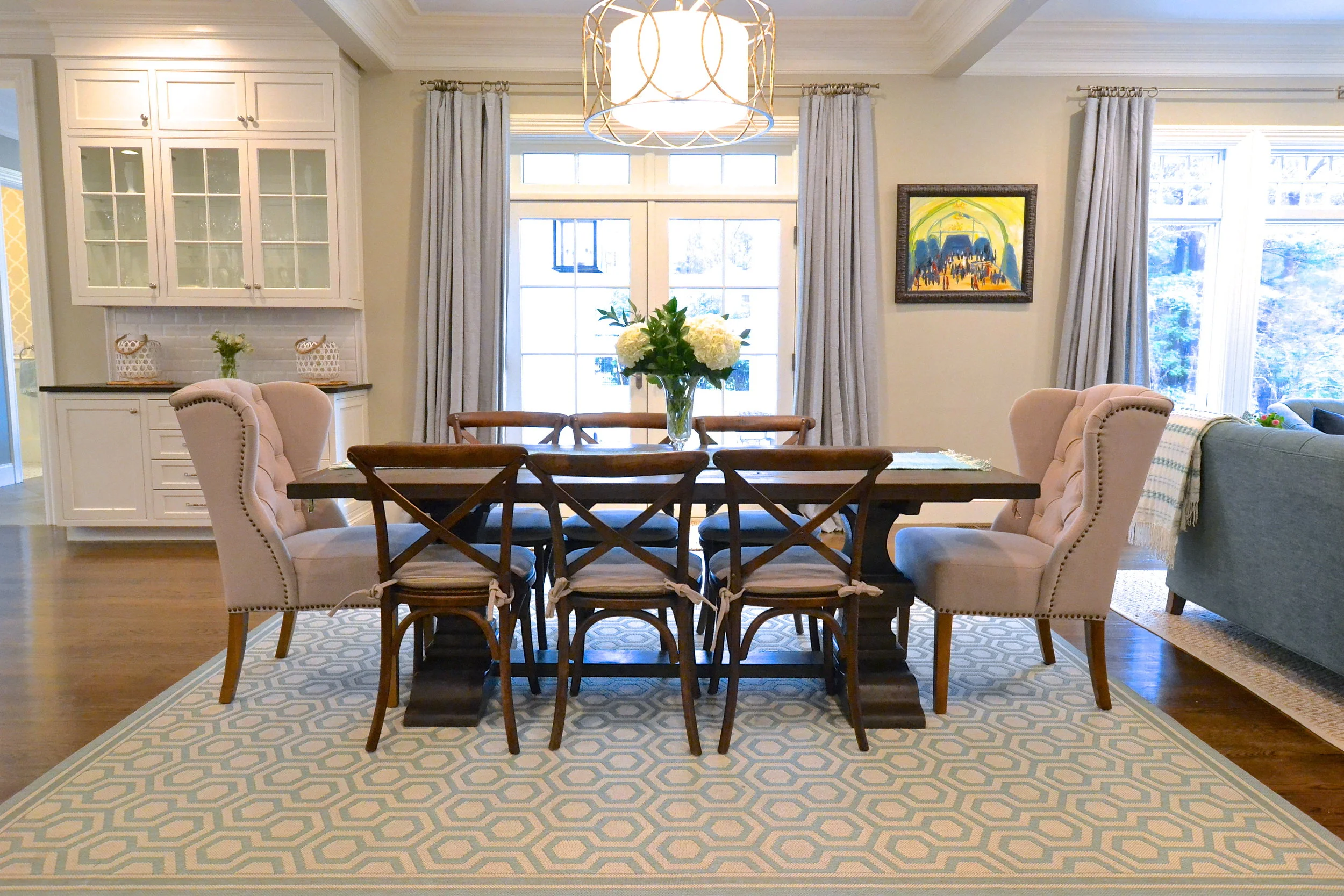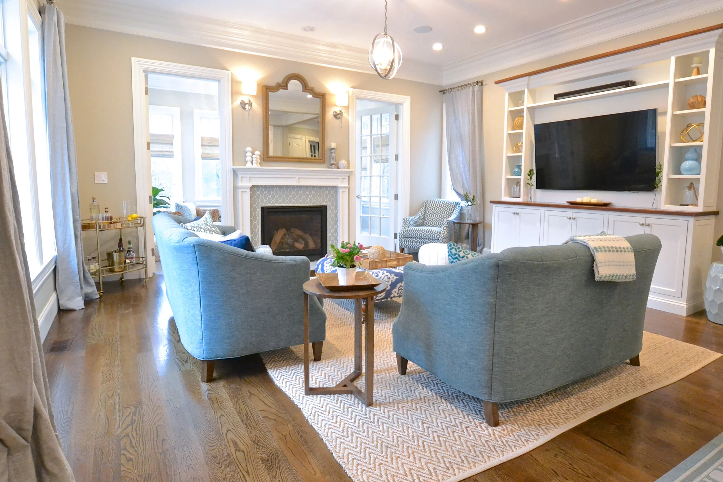 Our Essex Project is somewhere between coastal and traditional. Mixing classic elements (plantation shutters, marble basket weave floor tile and ornate crown molding) with that modern, elcectic coastal vibe (geometric prints, every shade of blue, seagrass and rustic wood) resulted in this open, inviting space.