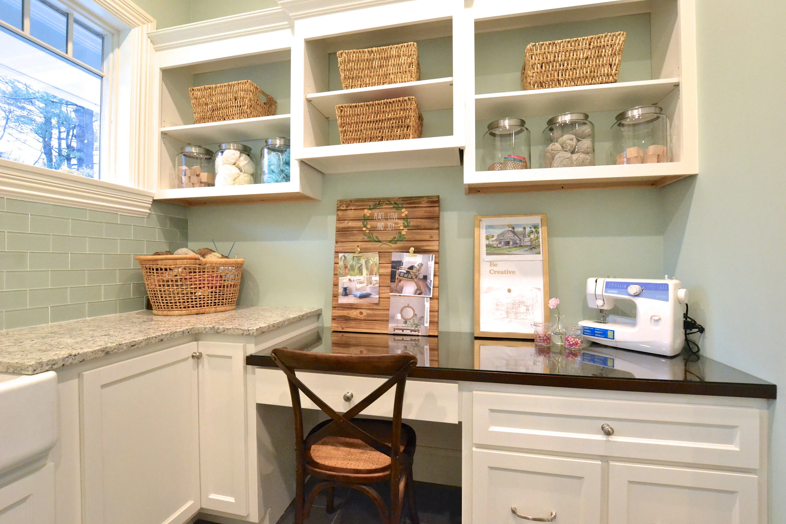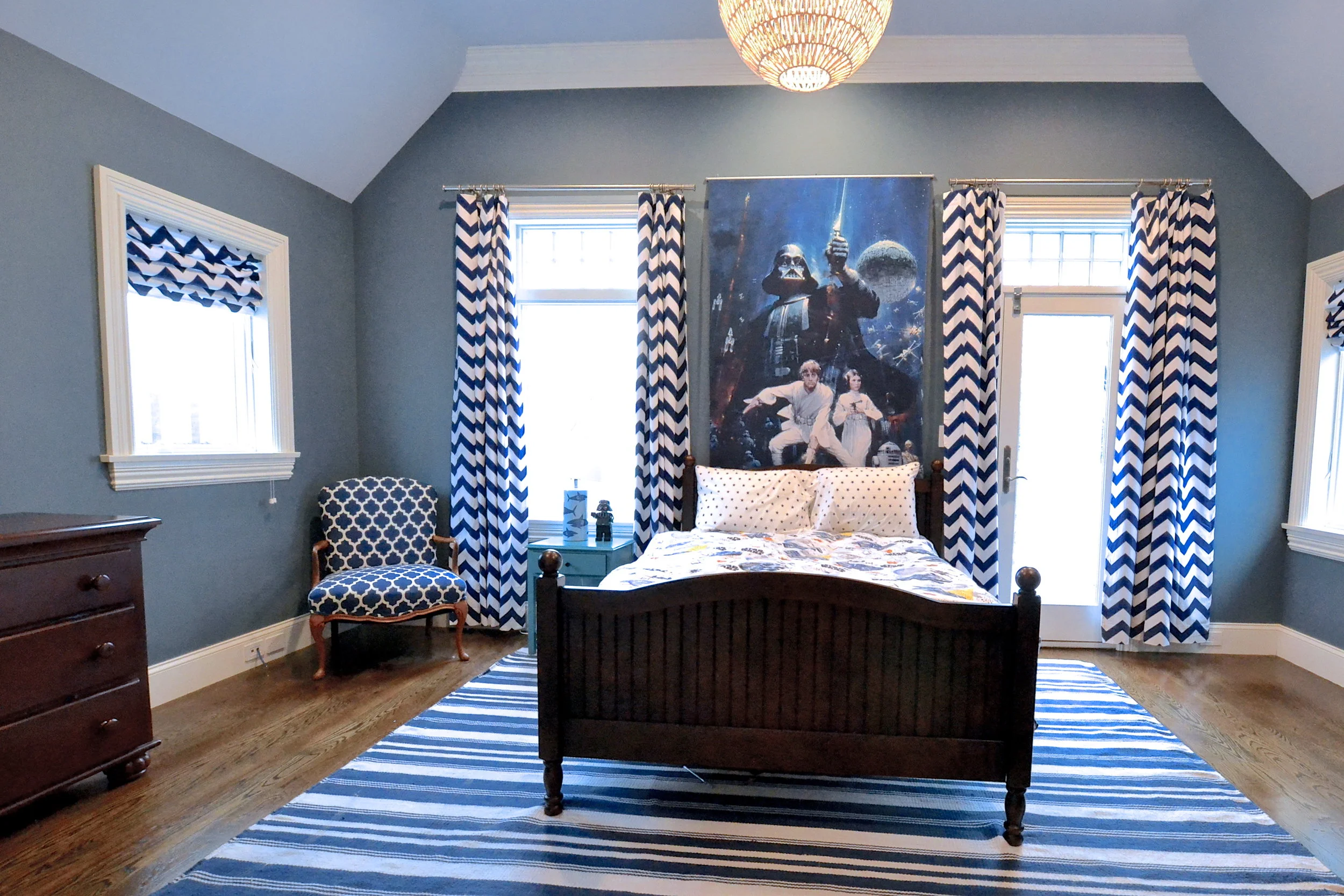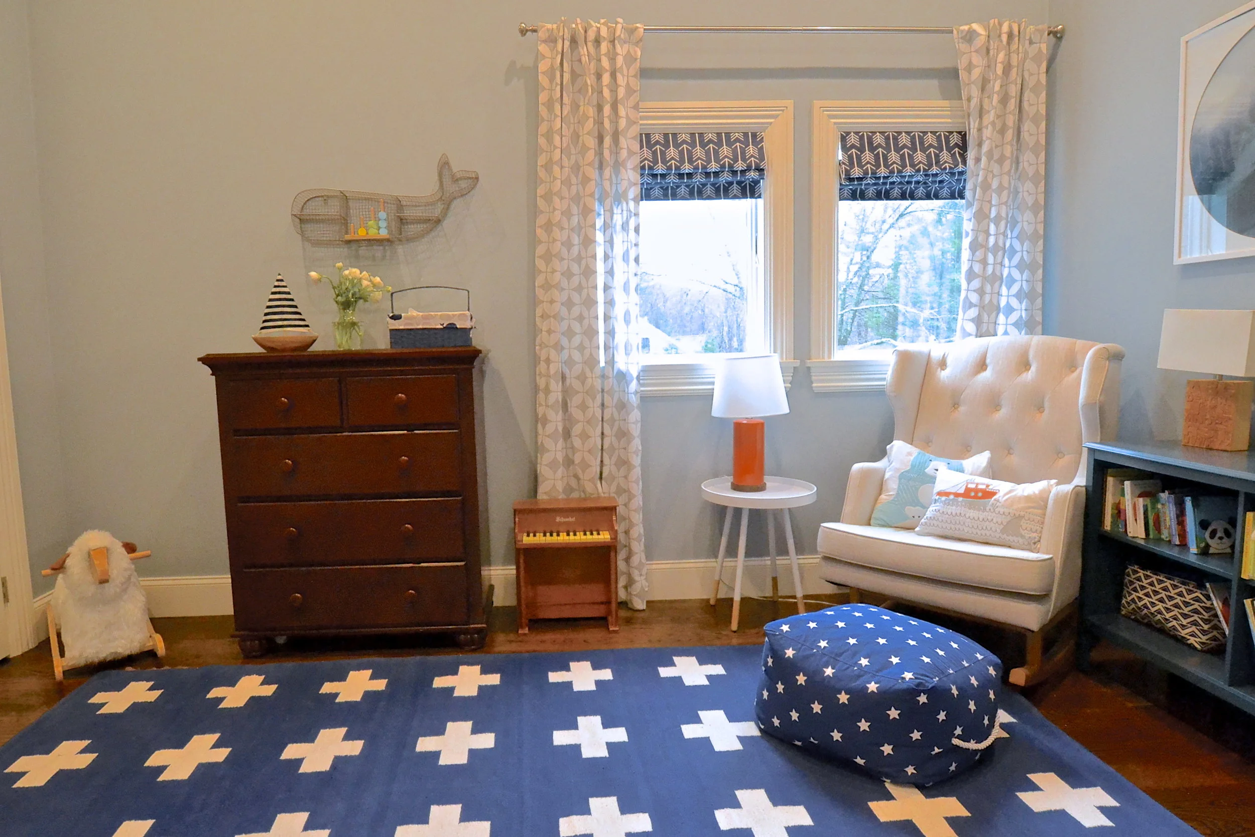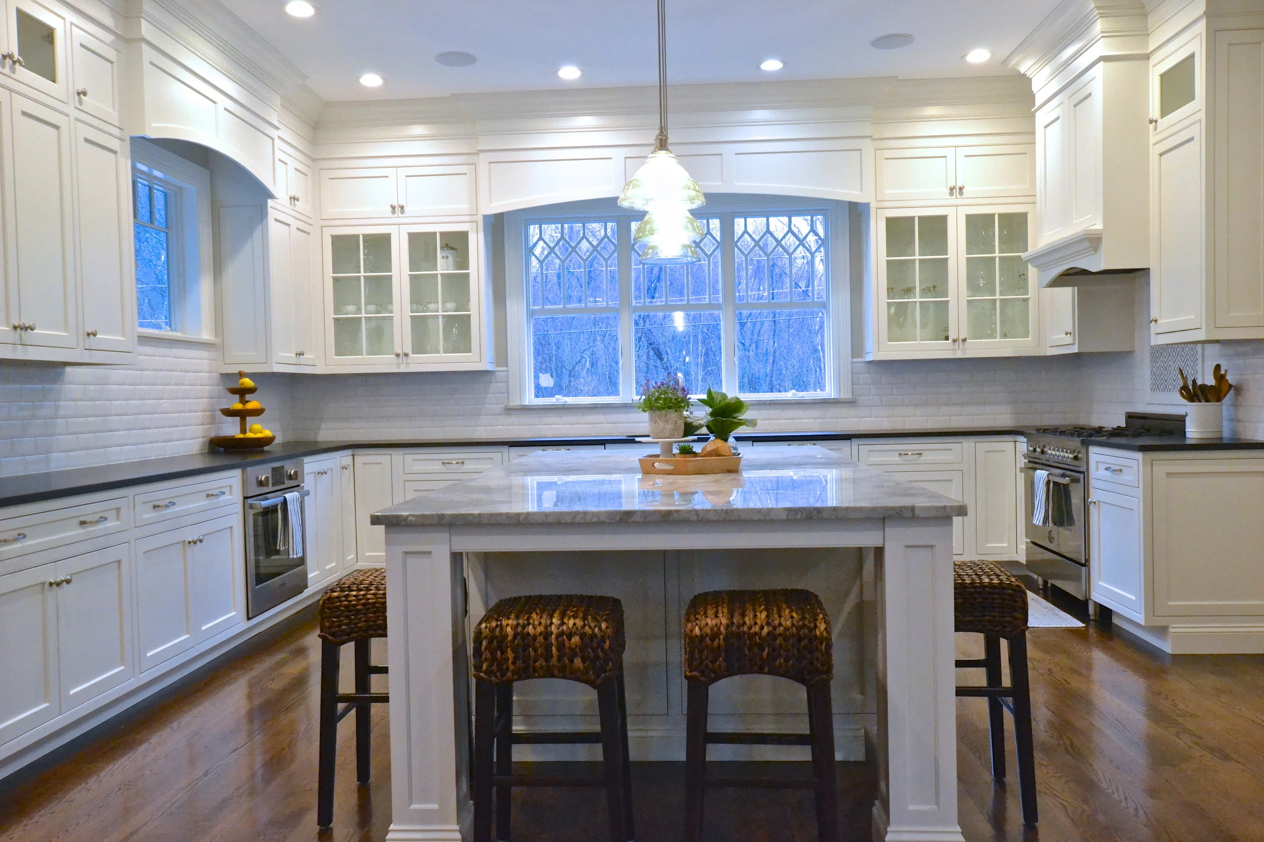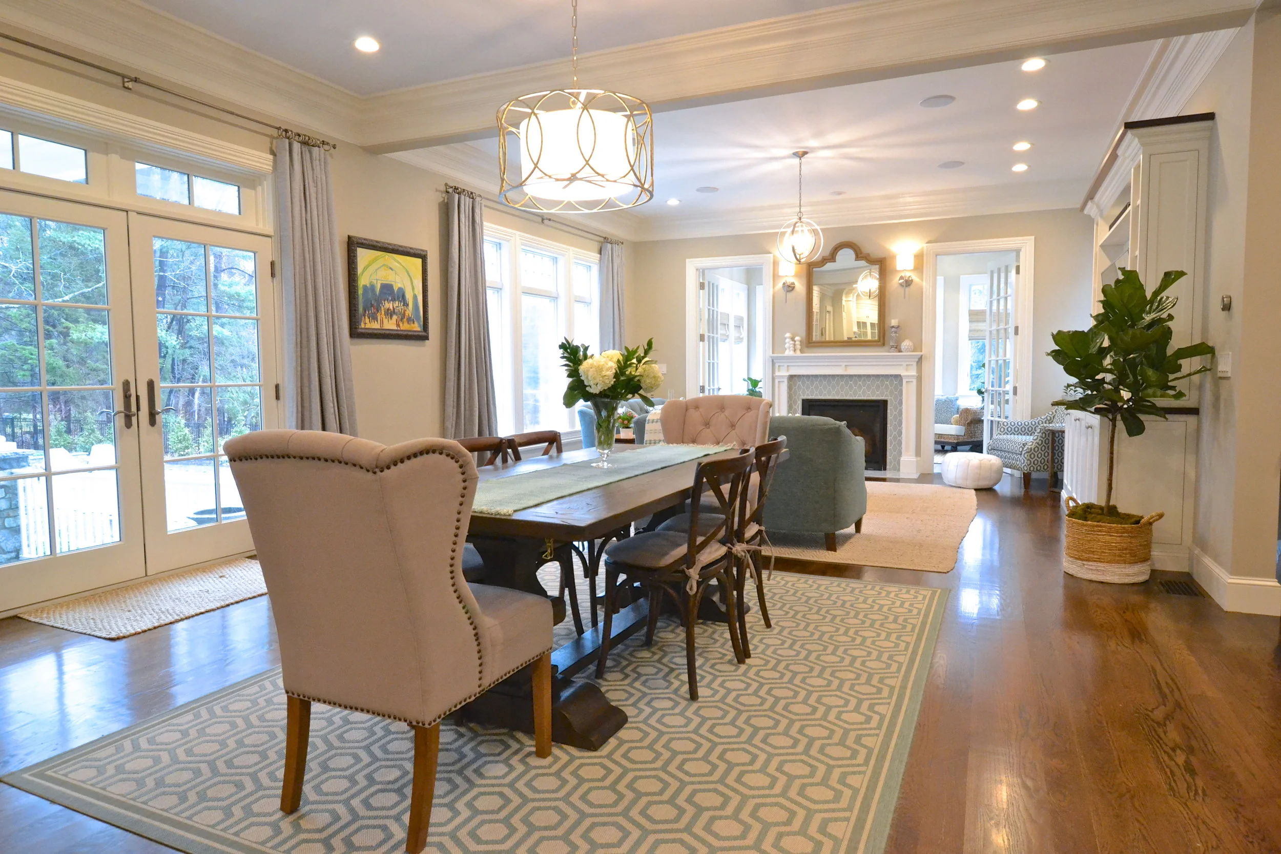 Our Essex Project is somewhere between coastal and traditional. Mixing classic elements (plantation shutters, marble basket weave floor tile and ornate crown molding) with that modern, elcectic coastal vibe (geometric prints, every shade of blue, seagrass and rustic wood) resulted in this open, inviting space.
