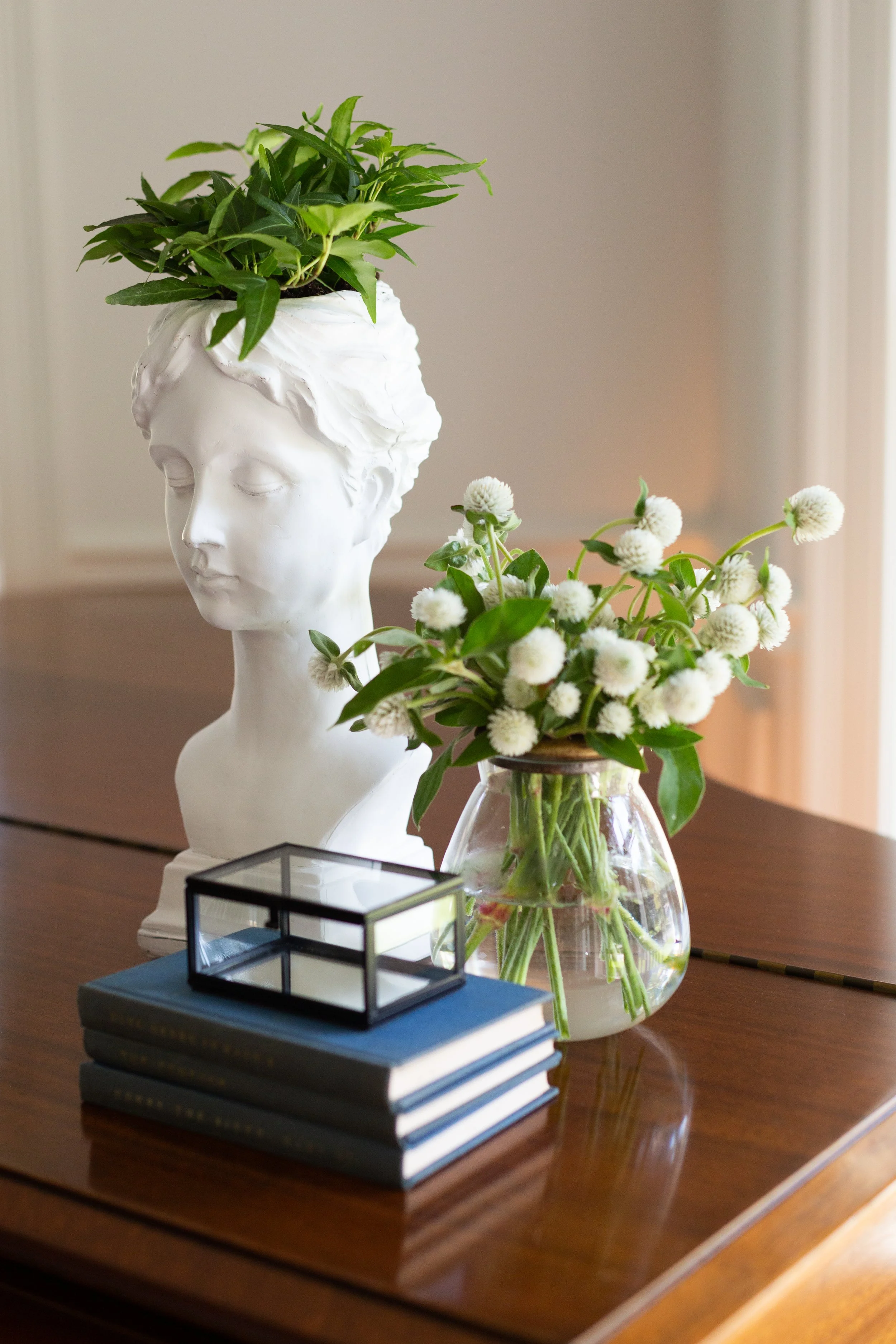Entry: This home has a two part entryway - one that is more driven by function and one that is more driven by beauty. This dichotomy exists in every room, and the footprint of this foyer happens to naturally divide the function from the pretty. Without a closet, and no place to build one, it was important to create a spot for guest coats, so the coat rack is part cool and part vintage, and adds a great touch of character. Stair runners are an investment, but also really worth it for families with young children and dogs because they create a visual impact. The rug style we chose is classic with just a little something that added color, texture, and personality to the space. The subtle chevron pattern with the contrasting stripes add the right amount of interest for this project, which has subtle, moody and modern vibes. Lastly, we chose a console table with a lower shelf and two drawers to provide lots of open and hidden storage. We also added functional decor. Oversized, shallow bowls are excellent for corralling keys and mail. And big baskets are excellent for incoming and outgoing packages.