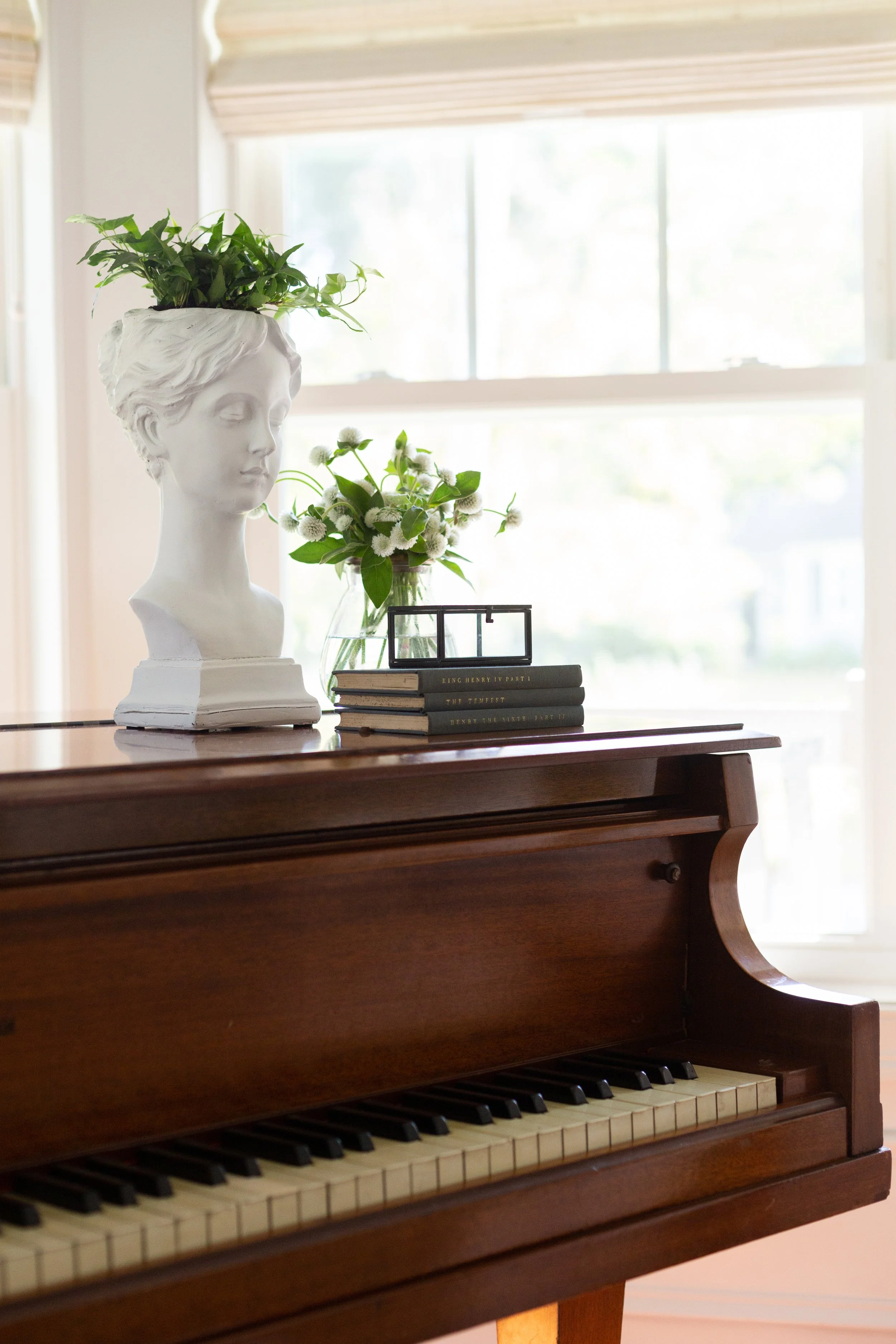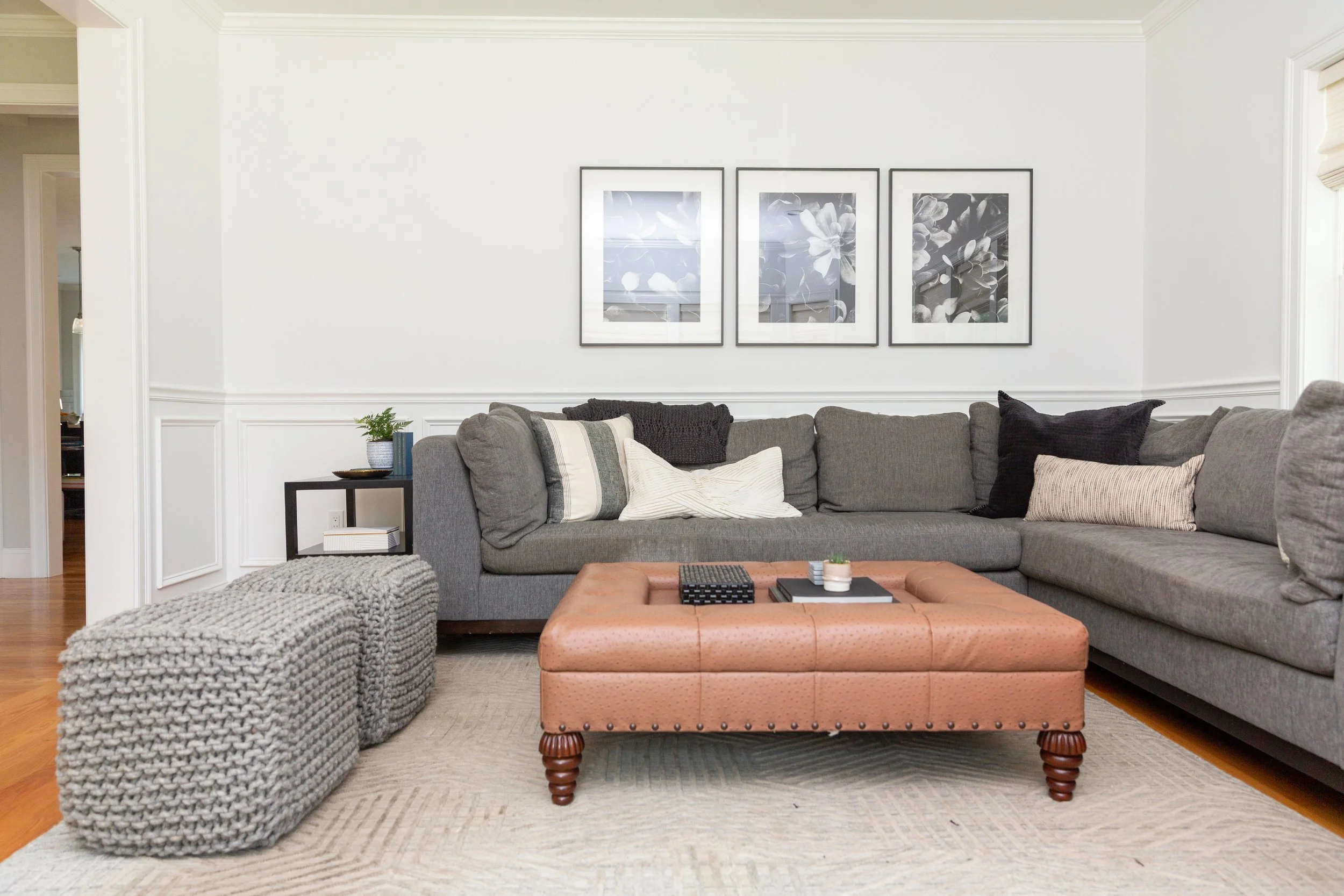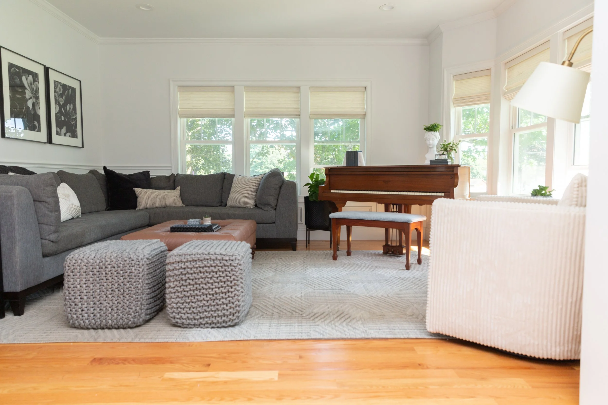 Piano Room: When we started this project there was nothing in the Piano Room other than the piano. We started by completely reimagining the layout as we considered fitting the existing piano, sectional, coffee table and rug. By shifting the piano into this bay window nook we were left with a squared off room for squared off furniture. With all the large furnishings in place, we layered in ancillary furniture that increased function and added personality. A side table next to the sofa arm, a swivel chair/side table/floor lamp scene, lots of decor and art, and a pair of poufs. For the swivel chair, we chose a plush fabric with oversized ribbing, and choosing texture was important because the color palette of this room is neutral and muted. The side table by the sofa is black, rectangular and tiered, and the side table by the swivel is round, pedestal and naturally stained wood. We introduced and repeated stripes everywhere. The rug is the most obvious stripe pattern. We also added the “striped” swivel and reupholstered the piano bench in a channeled, smoky blue velvet. And yet, even with all the stripes, ribbing, channeling, pleating and everything in between, it’s not overdone because it’s almost entirely tonal. The stripe concept is more of a texture than a pattern.